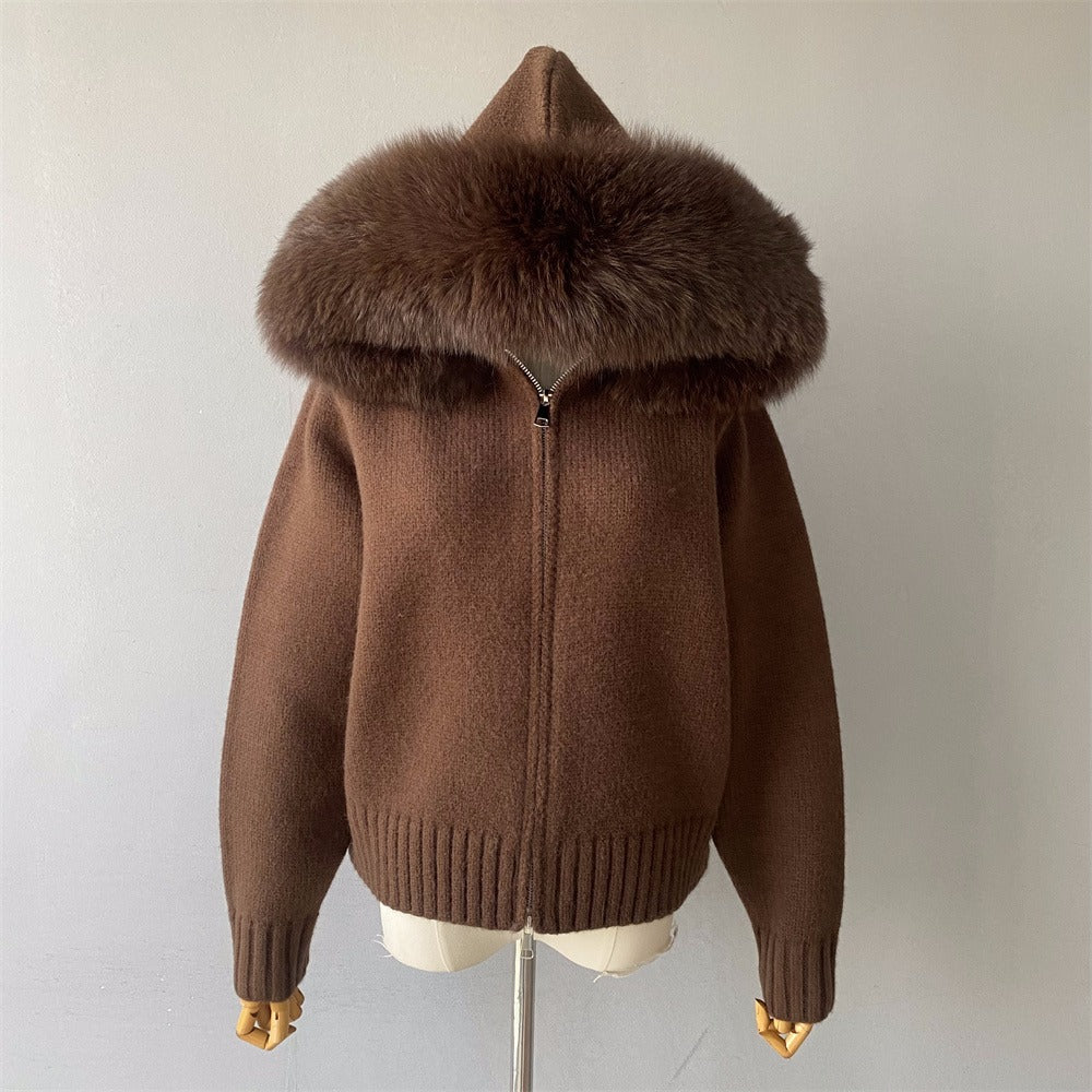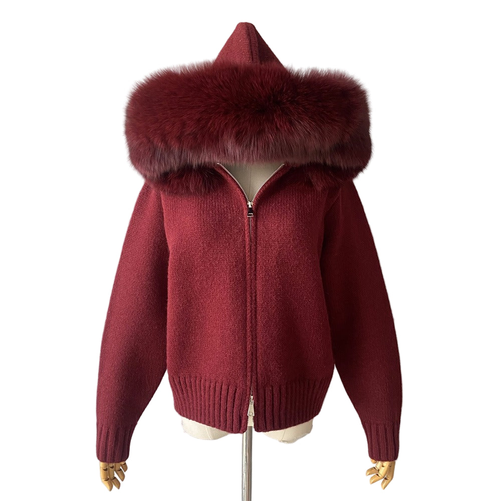 Beautiful knit sweater with FULL fox on outer perimeter of hoodie.